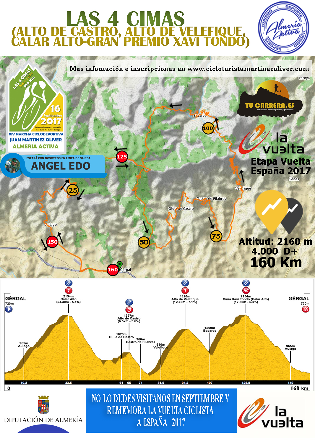 Por su parte, Martínez Oliver ha asegurado que los propios ciclistas profesionales le han tildado de “loco” por organizar este año un recorrido tan exigente que sólo acabarlo será todo un reto. La salida se dará desde Gergal. En medio del recorrido, parajes tan singulares como Calar Alto y los pueblos de Olula de Castro, Castro de Filabres, Velefique y Bacares.