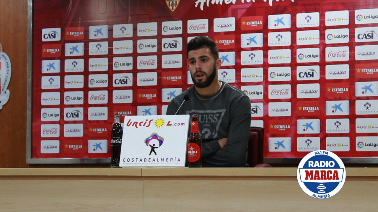 El extremo rojiblanco pasó por sala de prensa una vez terminada la sesión de entrenamiento para analizar la actualidad del Almería y el próximo partido ante el Huesca.