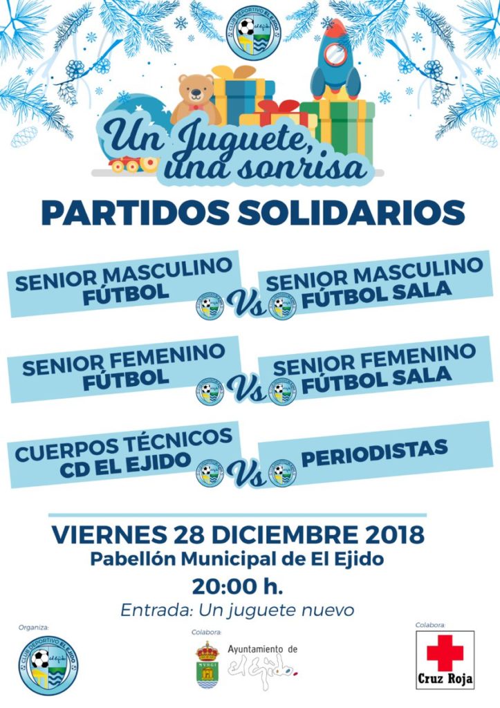 Antes de que todos los discípulos de Alberto González vuelvan a los entrenamientos, este viernes tienen lugar los Partidos Solidarios en el Pabellón Municipal ejidense, tomando parte los distintos estamentos de la entidad celeste desde las 20 horas, teniendo como objetivo recaudar juguetes para los niños más necesitados y, de hecho, la entrada es gratuita donando un juguete nuevo en este evento en el que colaboran el Instituto Municipal de Deportes de El Ejido (IMD) y Cruz Roja.